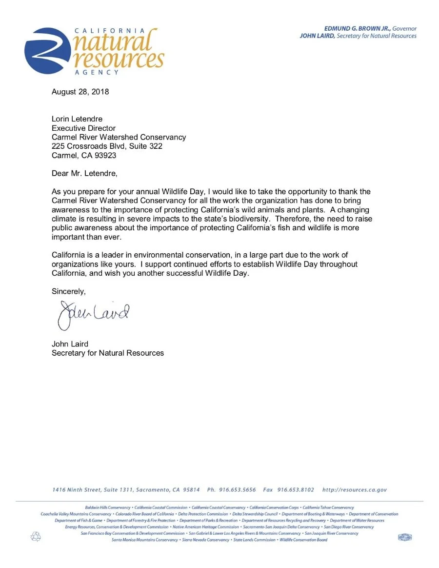 In August 2018, John Laird, Secretary for the California Natural Resources Agency, wrote a letter of support to Lorin Letendre, past President and Executive Director, for the work Carmel River Watershed Conservancy does to protect the wildlife of California.